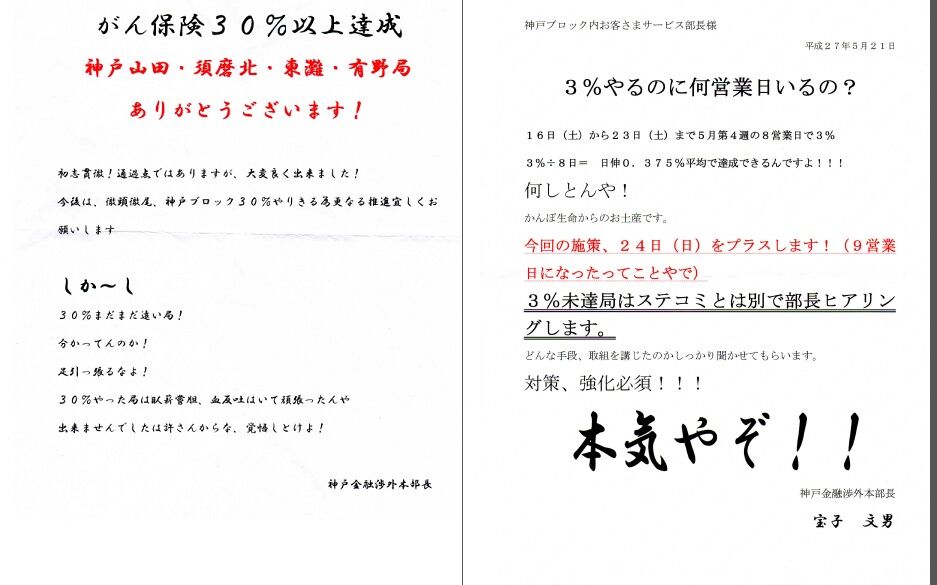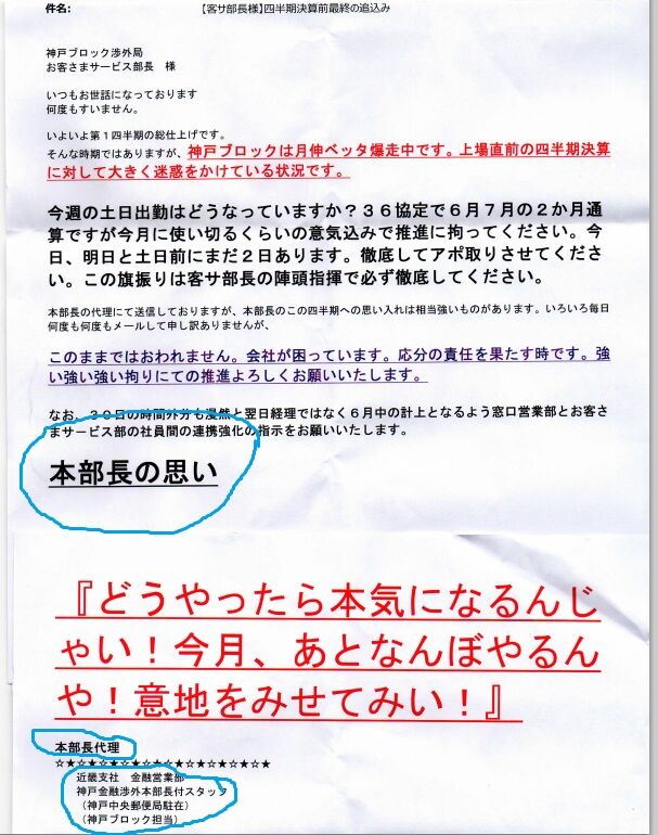 内容を要約すると「切手売ってくるまで帰ってくるな!売れなかったら自腹切れ!」です。見事なパワハラメールです。
