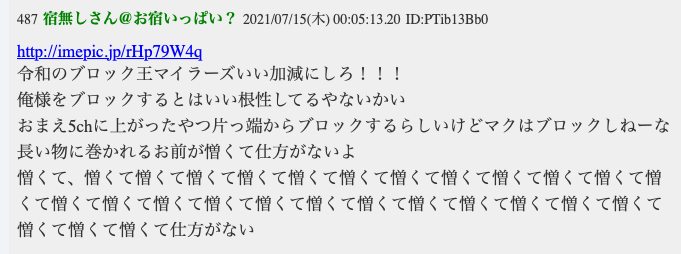 「本件はプロバイダーへの発信者情報開示請求訴訟において、書込みは違法なものであるとして、私への権利侵害が認められました(判決書抜粋)。判決で私の請求は全面認容され、プロバイダーから氏名/住所/電話番号等が開示されました。開示後、相手は私からの謝罪要求に即座に応じてくれました」と経緯を明かし「ネットの誹謗中傷に対し社会の目はとても厳しくなっています。厳罰化や開示の簡素化などの法整備もされます。開示されたら個人が明らかになり、不法行為の責任追及を受けることになります。そんなリスクを冒して人を誹謗中傷をすることに何の意味や価値があるのか、私には全く理解できません」と怒りをあらわに。