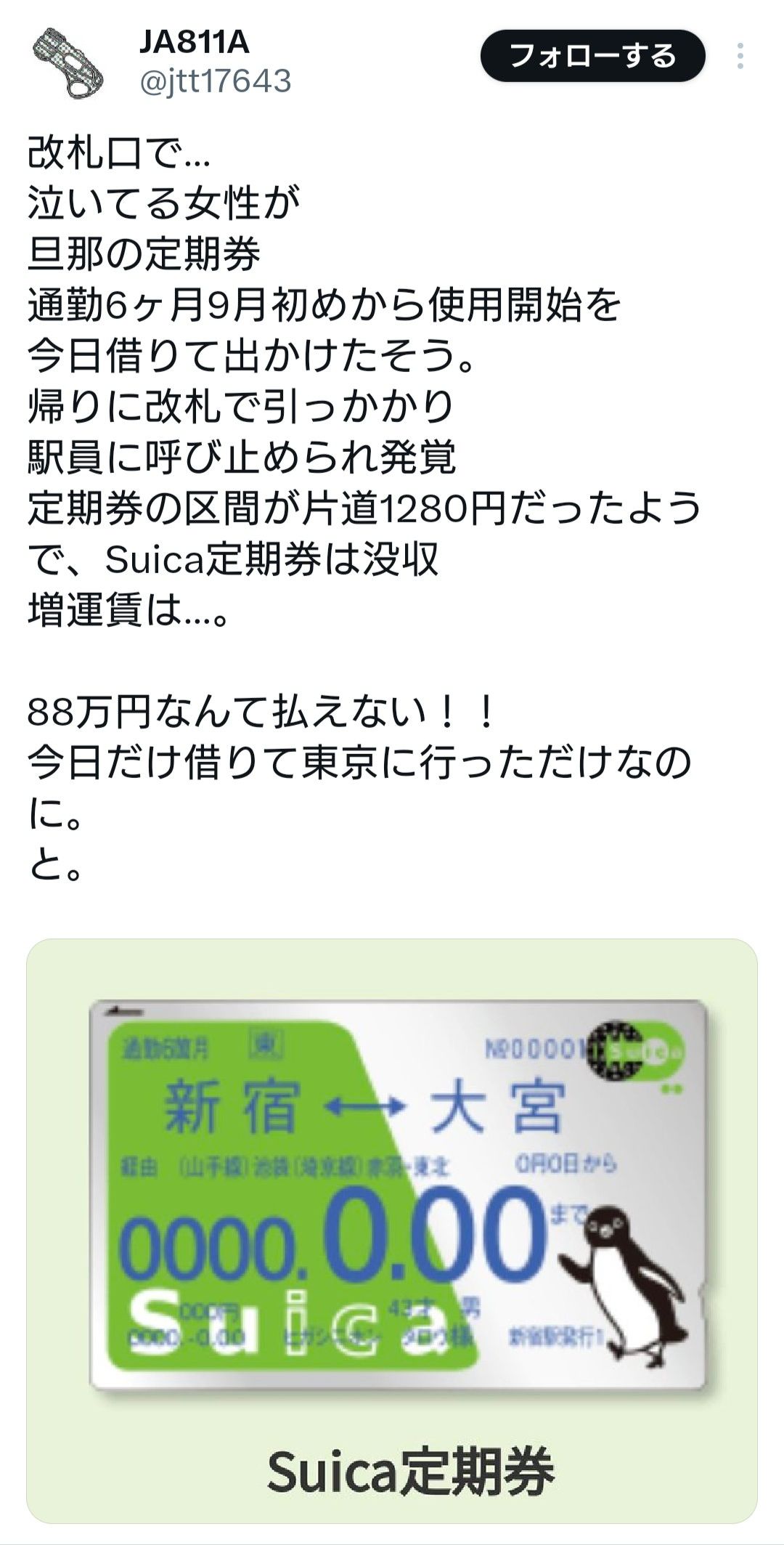 駅員がSuicaに記載されている氏名を確認したら男性名、なのに申告者は女性
