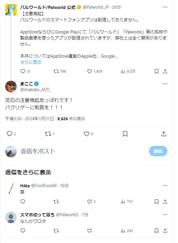 — パルワールド/Palworld 公式 (@Palworld_JP) January 31, 2024