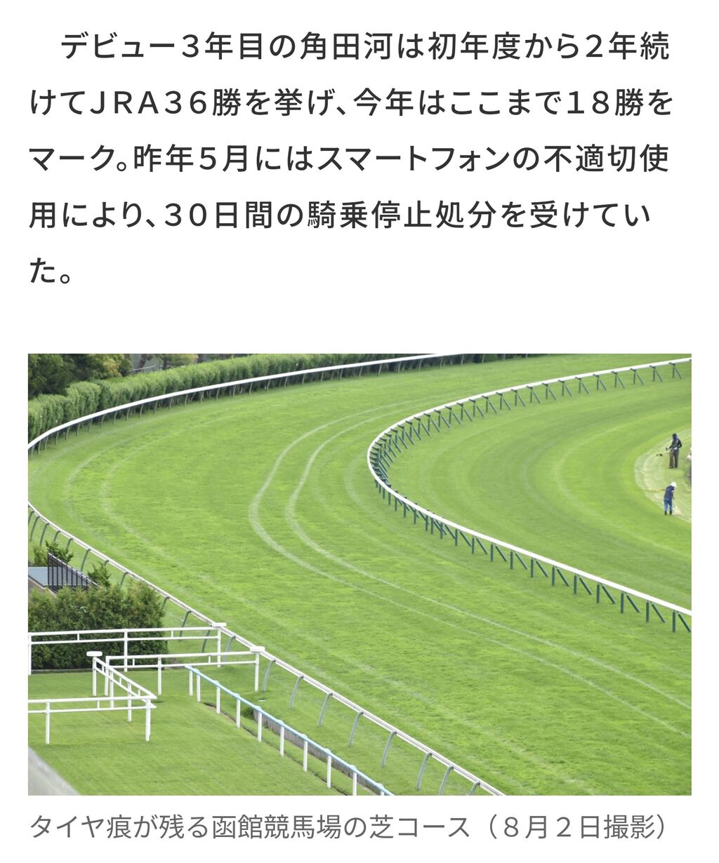 騎手 角田 大河(栗東・石橋 守厩舎)は、2024年8月1日(木曜)午後8時30分頃、函館競馬場の馬場内に自らが運転する自動車で侵入し、芝コースを損傷させた事実が判明しました。