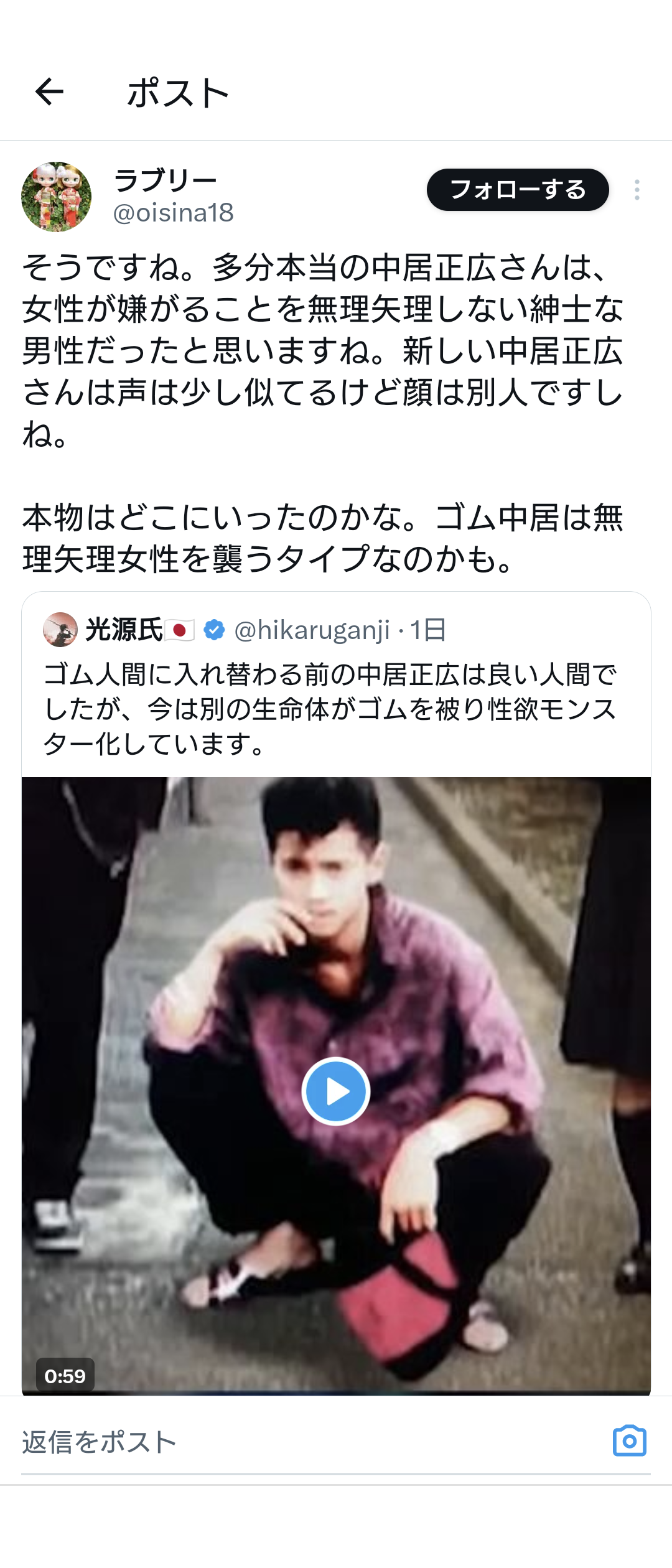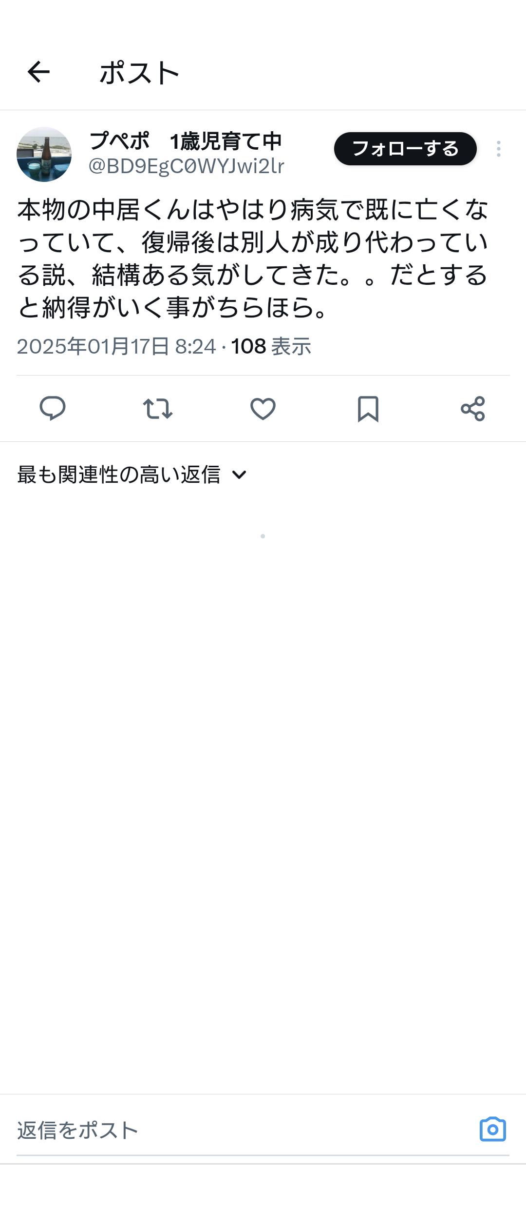 あるアカウントは《本物の中居くんはやはり病気で既に亡くなっていて、復帰後は別人が成り代わっている説、結構ある気がしてきた。。だとすると、納得がいく事がちらほら》と、現在の中居が偽物であるとの考えを投稿。また、別のアカウントも《多分本当の中居正広さんは、女性が嫌がることを無理矢理しない紳士な男性だったと思いますね。新しい中居正広さんは声は少し似てるけど顔は別人ですしね。本物はどこにいったのかな》と、やはり、「本物はどこにいったのかな」という具合に、現在の中居が「別人」であると主張しているのだ。